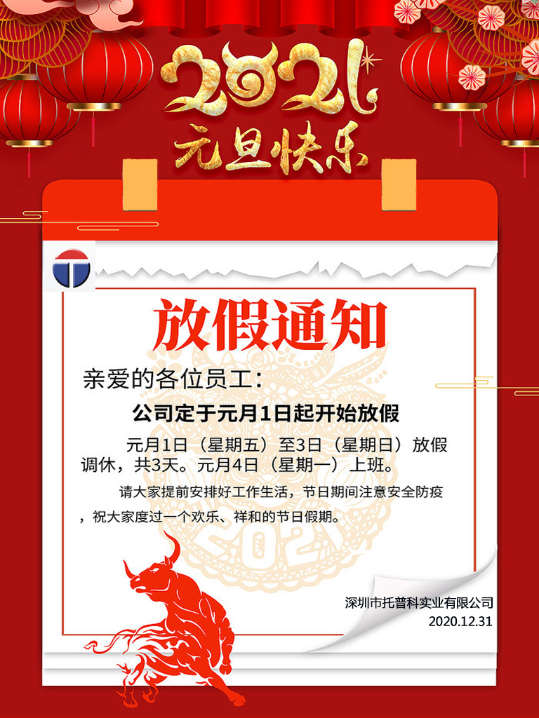 2021元旦將至,在這美好的日子里,我們根據《國務院辦公廳關于2021年部分節假日安排的通知》及結合我司實際情況,現把放假時間及注意事項通知如下: