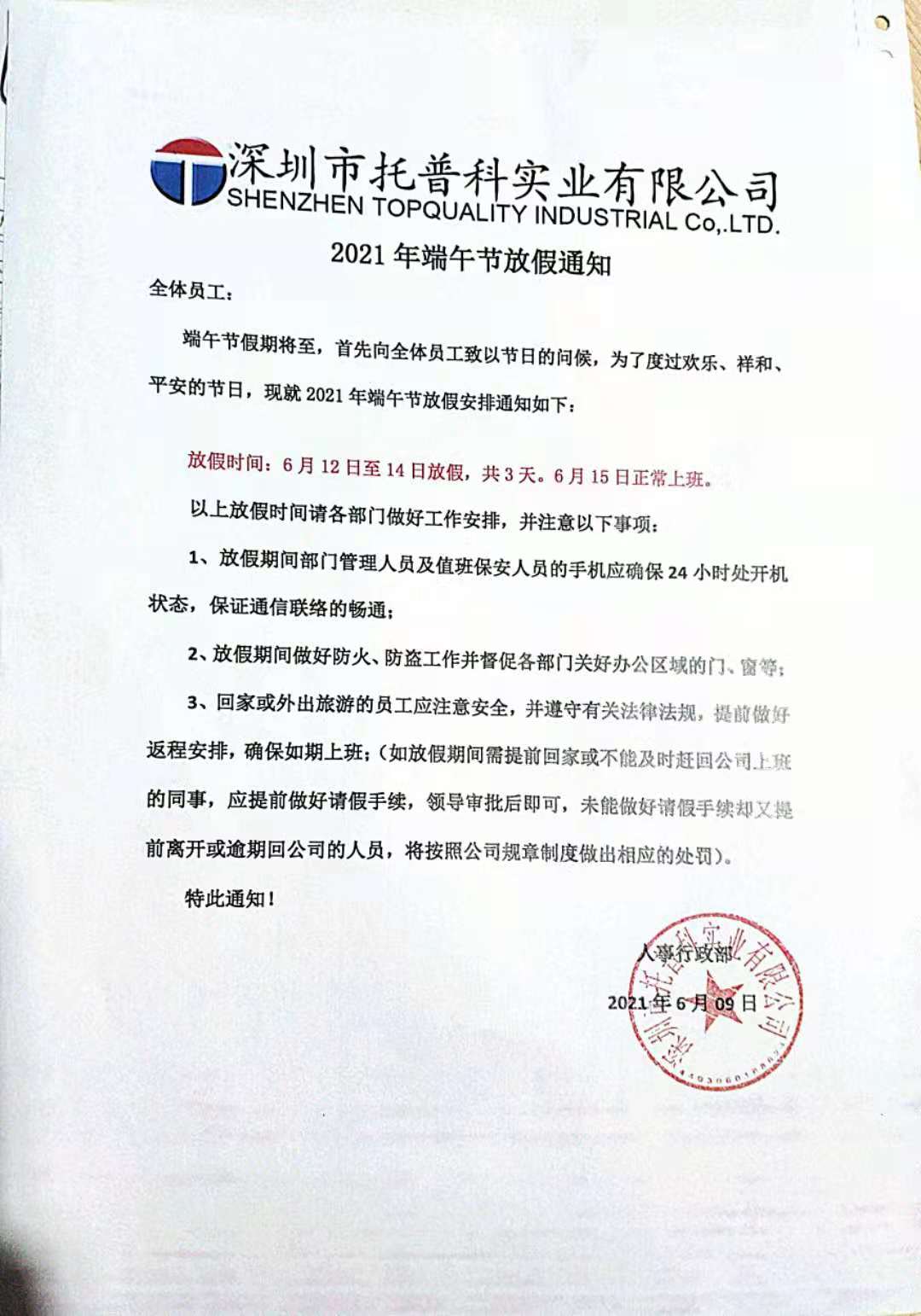 深圳托普科實(shí)業(yè)2021端午節(jié)放假通知