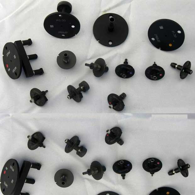 吸嘴形狀有方孔,圓通,V槽等。訂做的吸嘴,一般根據料的形狀,選取平整的吸著點,有些做成伸長的吸嘴,伸進料的凹槽平面吸取,有些根據料的邊緣,做成回字型,有些兩端用平面,中間不平,則要搭個橋。有些料有粘性,不好放料,則要在吸嘴壁開些槽,或是做成膠頭。