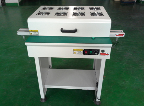 aoi位于smt生產線的后段,是通過接駁臺連接回流焊,因經過回流焊高溫焊接(通常會達到220攝氏度),而在經過冷卻區后,某些pcba板子的余溫還是比較高,因為在回流焊后面(即aoi前)加冷卻接駁臺,冷卻接駁臺顧名思義就是起到冷卻的作用,目的是為了加快剛焊接出來的pcba板降溫,相對于普通的接駁臺,就是在接駁臺上方加了許多的風扇,使pcba通過接駁臺的時候可以更快降溫。冷卻接駁臺如下圖所示